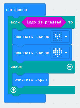 Еще одна несложная программа microbit2-Сенсорный-логотип-2.hex демонстрирует использование блока logoispressed (рис. 3.14).
