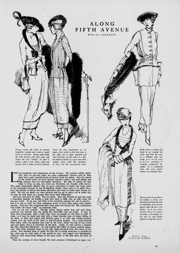 Мы уже и так делаем все, что в наших силах; несмотря на инфлюэнцу, вдвое сократившую количество рабочей силы, и забастовку продавщиц, доставившую столько хлопот и без того расстроенным модельерам, женщины, словно по волшебству, каждый день щеголяют в новых очаровательных нарядах (Vogue. 1919. January 1).