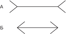 Обсуждая то, что образ меняется в зависимости от контекста восприятия, чего не должно было бы быть, если бы между объектом и его образом была жесткая прямая причинно-следственная связь, М. Мерло-Понти [1999, с. 35] обращает наше внимание на то, что отдельно взятый отрезок прямой линии (Л) и аналогичный отрезок (Б), включенные в рисунок Мюллера-Лайера. не являются для восприятия «одним и тем же отрезком (рис. 4).