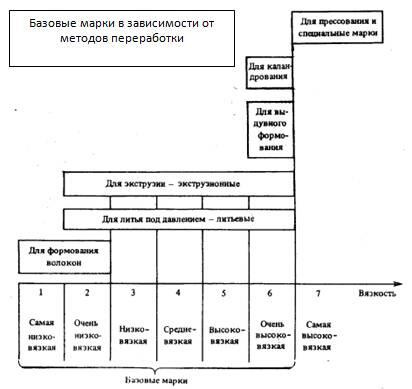 Рис. 2.4. Распределение базовых марок полимеров по методам переработки в зависимости от вязкости.