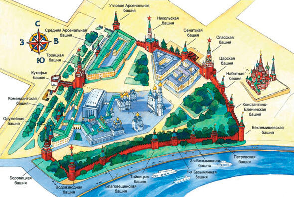 Московский Кремль, самая крупная из сохранившихся крепостей Европы, расположен на Боровицком холме, на более высоком левом берегу Москвы-реки, в том месте, где в нее впадает река Неглинная. В плане Кремль представляет собой треугольник неправильной формы площадью 27,7 гектара, окруженный мощным стенами из красного кирпича с башнями. Южная стена обращена к главной реке российской столицы, северо-западная к Александровскому саду, восточная к Красной площади.