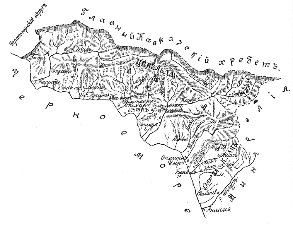 Абхазия в этнографическом отношении состоит из трех частей: Абхазии, Самурзакани и Цебельды. Абхазия занимает пространство от Гагр и до реки Окум, Самурзакань от реки Окум до Ингура и Цебельда занимает место в юго-восточной части. В административном отношении Абхазия разделена на четыре округа: Гудаутский с городом Гудауты, Гумистинский с городом Сухум-Кале, от Псыртсхи и до Кодора, Кодорский с городом Очемчиры, до реки Гализги, и Самурзаканский с городом Окумы.