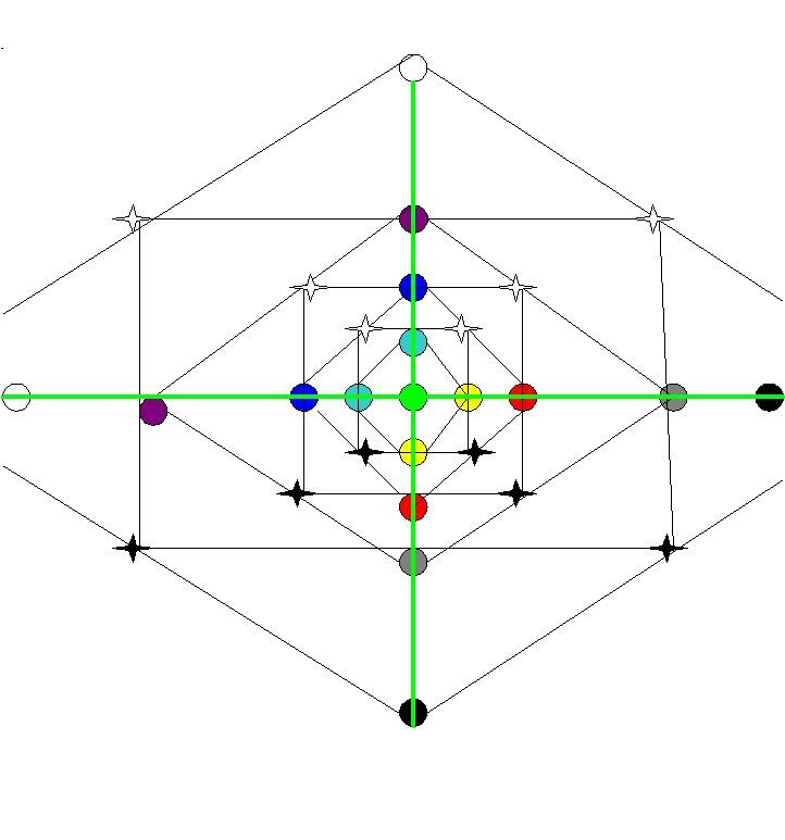 . Схема только кажется сложной на самом деле на ней в упрощенном виде отображено то, о чем мы говорили сейчас и в предыдущих рассылках. Привычная нам Шри-Янтра отображает форму проявленного мира и ту форму, которую мы принимаем в нем. Но, если соединить все расщепленные треугольники и сжать их основания до центральной точки, мы получим отображение иной, крестообразной структуры, которая гораздо ближе к нашей истинной форме. Вертикальная линия креста, то есть вертикальная линия Воли, соединяет те центры, которые проецируются в наше физическое тело то есть «чакры». В центре находится Анахата, над ней голубой шар вишудха, под ней желтый шар манипула и так далее. То есть семь основных чакр и две дополнительных белый шар соединяет нас с Верхним Пределом и находится над теменем, а черный шар соединяет нас с нижним пределом и находится чуть ниже промежности. Вертикальная линия Воли и связанные с ней чакры являются основными, когда мы находимся в состоянии покоя например, сидим в глубокой медитации. Но в таком состоянии мы находимся довольно редко в обычных случаях мы взаимодействуем либо с пространственными структурами внешнего мира совершаем конкретные действия, то есть движемся вперед. Либо с временными структурами движемся по разного рода Узорам, которые в большинстве случаев нами не осознаются они действуют для нас как бы сзади. В обоих случаях мы взаимодействуем с внешним миом с тем, что находится за пределами нашего тела., а чтобы с ним взаимодействовать, нам нужна структура, выходящая за пределы нашего тела она и отображена на горизонтальной линии Воли. Центром этой структуры тоже является Анахата, влево от которой находится четыре шара, соответствующие уровням Левой стороны -. желтый шар Альфа-уровню, красный шар Тэта-уровню и так далее. А вправо четыре шара, соответствующие. уровням Правой стороны голубой Бета-уровню, синий Гамма-уровню и так до уровня Абсолюта это белый шар. То есть наша внутренняя структура представлена семнадцатью основными центрами, восемь из которых находиться в вертикальной плоскости, восемь в горизонтальной, а главный цент Анахата, связывает эти плоскости между собой.