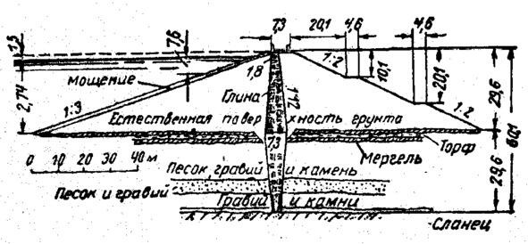 Рис.1.6. Типовой профиль Иваньковской песчаной плотины с деревянной противофильтрационной диафрагмой и металлическим шпунтом в основании [12].