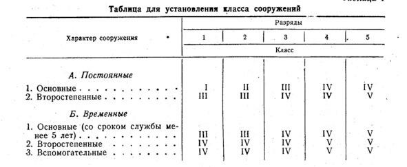 По производственной эффективности сооружения делятся на пять разрядов (подробнее см. ГОСТ 331546). Определение класса и разряда сооружения необходимо для назначения коэффициентов запаса в расчетах с учетом всех факторов, влияющих на эксплуатацию сооружений, включая объем работ при изысканиях и состава проекта.