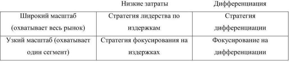 М. Портер предложил типологизировать конкурентные стратегии, основываясь, с одной стороны, на масштабе рынка (широкий, узкий) а, с другой, на направлении приложения усилий организации: либо на минимизации издержек, либо на выпуске уникальной продукции. Комбинации перечисленных предпочтений дают возможность выделить четыре типа стратегий (рисунок 5) [28]: