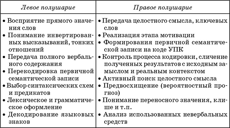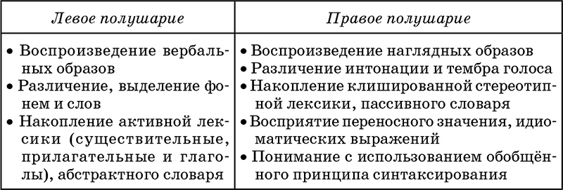 Для детской логопсихологии значимы сведения относительно значения роли левого и правого полушарий в осуществлении речевых действий и операций (Л. Я. Балонов, В. Д. Деглин, М. К. Кабардов, М. А. Матова и др.), представленные в таблице 1.