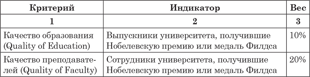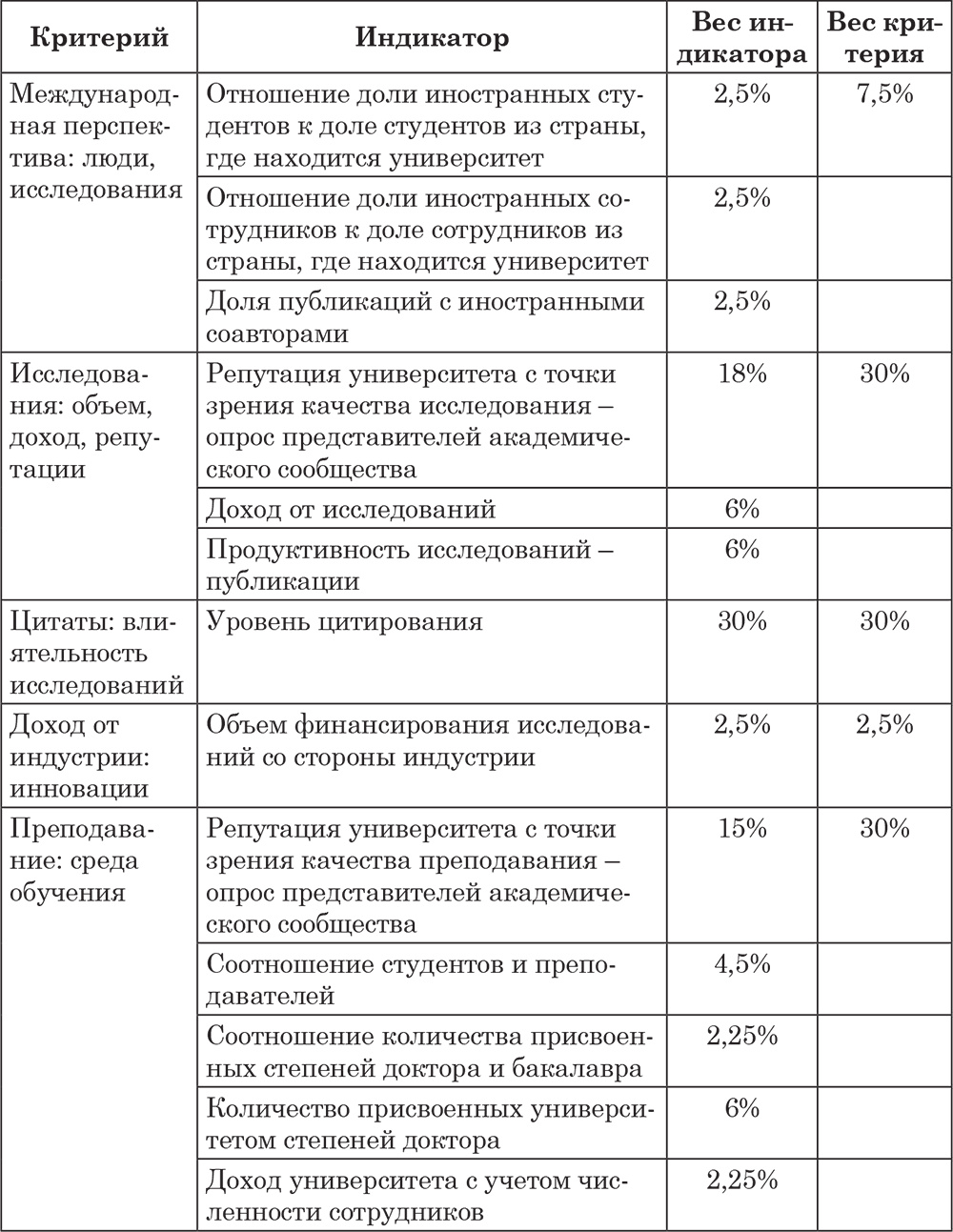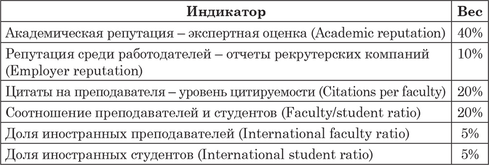 Всемирный рейтинг университетов (QS) от Quacquarelli Symonds британский ТОП-200 составляется в результате оценки шести показателей (табл. 5):