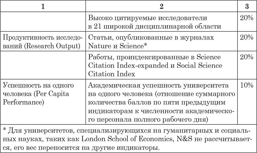 Рейтинги Times Higher Education лучших университетов по всему миру составляются по 13 отдельным показателям, необходимых для сбора полного спектра деятельности университета, от преподавания до исследовательской деятельности. Эти 13 показателей разделяют на 5 категорий (табл. 4):