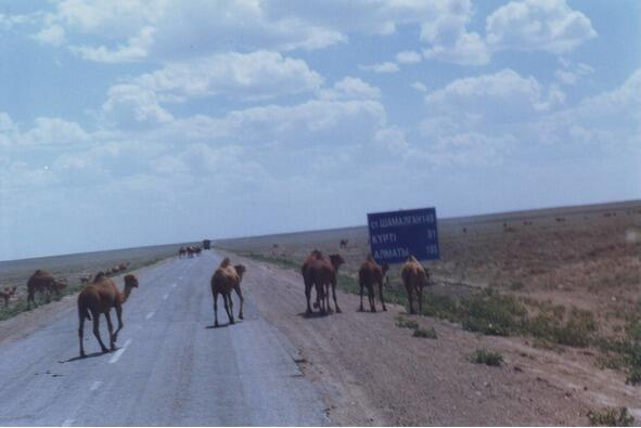 Вчера мы узнали бизнес-секреты перевозки арбузов, а сегодня нам повстречались перегонщики лошадей. Большой табун, голов 100, показался на горизонте, и вот вскоре на трассу выехали пастухи два казаха, в окружении перегоняемого товара. Лошади, купленные в Павлодаре (на севере Казахстана) примерно по $700, почти добровольно направлялись своим ходом в Алматы, не зная, что там их оптом сдадут по $1000 на мясокомбинат. В день табун проходит 2030 километров, стало быть перегон длится очень долго, от месяца до двух. Подъехал и хозяин лошадей, очень жирный казах 120 кг весом на широком жирном джипе. Вылез, поглядел, как идёт перегон, и поехал завтракать в посёлок.