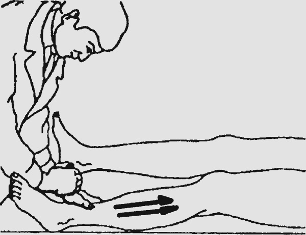 Выжимание на передней поверхности голени. Массируемый лежит на спине, нога согнута в тазобедренном и коленном суставах, пятка на кушетке, а верхняя часть стопы упирается в бедро массажиста (это позволяет расслабить мышцы на всю глубину), который сидит на уровне стоп. Ближней рукой он фиксирует согнутую конечность в коленном суставе, а дальней проводит выжимание с внешней стороны голени по двум-трем линиям от стопы до коленного сустава (рис. 22). Большой палец продвигается вдоль передней берцовой мышцы, а четыре пассивно скользят по икроножной мышце.