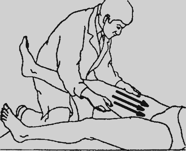 Выжимание на передней поверхности бедра. Нога массируемого лежит на бедре у массажиста. (Это позволяет расслабить мышцы бедра, создать естественный отток крови и лимфы.) Дальней рукой, поддерживая ногу в области подколенной ямки, он отводит и супинирует ее, а ближней проводит выжимание по трем-четырем линиям на внутреннем участке. Дойдя до середины бедра, меняет положение рук: ближней поддерживает ногу, а дальней делает выжимание по трем-четырем линиям на наружном участке (рис. 21).