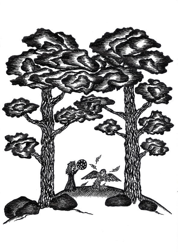 Войдя в дом, я чуть не лишился чувств. На полу у печи в неестественной позе сидела обёрнутая в шкуру девушка. Вокруг неё лежали разбросанные вороньи перья, а ноги и руки незнакомки были связаны обрывками подола старухи. Её голова была опущена, волнистые чёрные волосы свисали водопадом до пола, и за этой завесой не было видно лица.