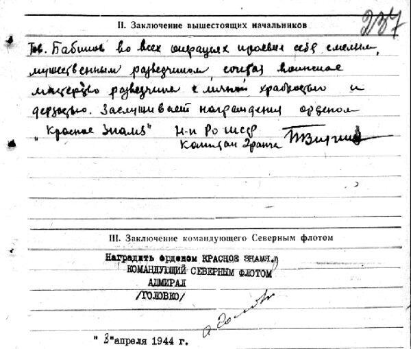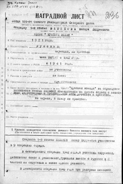Наградной лист М.А. Бабикова на орден Красного Знамени