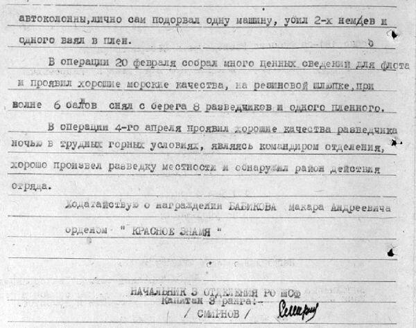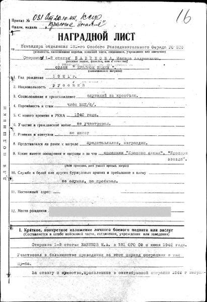 Наградной лист М.А. Бабикова на орден Красной Звезды