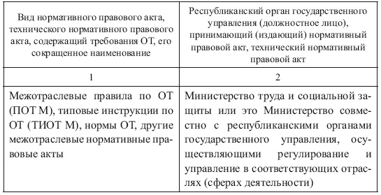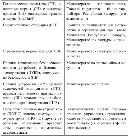 В соответствии с постановлением Совета Министров Республики Беларусь от 10 февраля 2001 г. 150 система нормативных правовых актов, технических нормативных правовых актов, содержащих требования ОТ, состоит из межотраслевых и отраслевых правил по ОТ, типовых инструкций по ОТ, норм ОТ, санитарных норм, правил и гигиенических нормативов, государственных стандартов, строительных норм, правил технической безопасности, правил устройства и безопасной эксплуатации, других нормативных правовых актов, технических нормативных правовых актов (табл. 1.2).