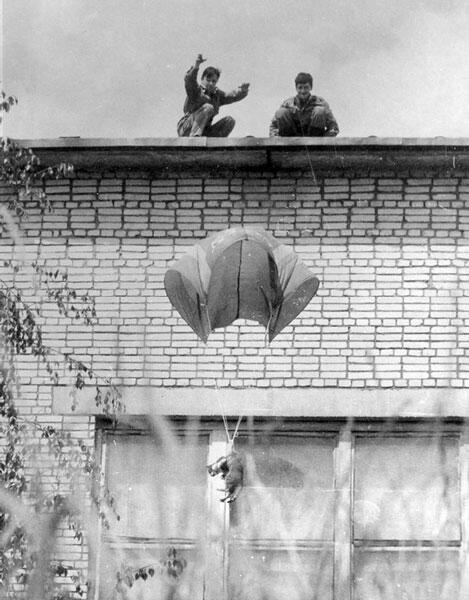 Алька отловил кота, прикормил его остатками курсантского ужина, надел на кота парашют, и из окна третьего этажа выбросил кота на улицу. Парашют раскрылся. Кот, с мяу меняющейся тональности (по-нашему, он явно хотел выругаться) плавно летел в сторону плаца. Приземлился удачно.