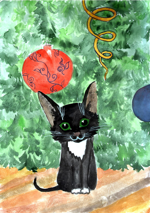 Санта был чёрный, с бодро торчащими ярко-белыми усами и бровями. Да-да! Бровями! Ведь у котят тоже есть брови, и даже бакенбарды есть, они прячутся у котиков чуть подальше усов, прямо на щёчках! Кошки очень мудрые и хитрые существа, и чтобы только понять, что там им предлагают пожевать хозяева, они проверят это, перво-наперво, своими усиками-антеннами, даже нисколько не испачкавшись в том, что не сочтут нужным скушать.