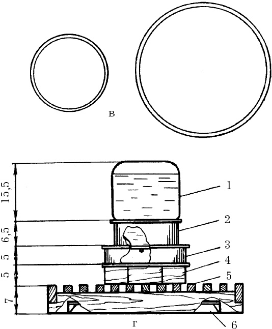 Рис. 20. Вакуумная поилка: а общий вид; б манжета; в таз-поддон; г план конструкции: 1 банка или бутыль на 3 л воды; 2 подставка для банки или бутыли; 3 поддон; 4 деревянная подставка; 5 планчатая подставка под поилку; 6 противень для сбора питьевой воды (размеры даны в см)