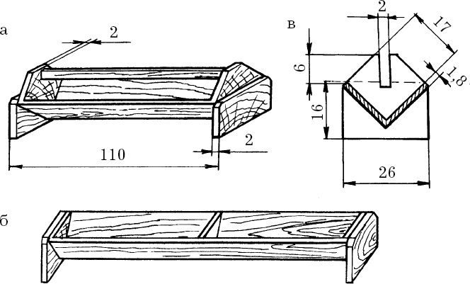 Рис. 17. Желобковая кормушка: а с ручкой; б без ручки; в вид сбоку (размеры даны в см)