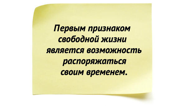 Первым признаком свободной жизни, очевидно, является возможность распоряжаться своим временем по своему усмотрению. Представьте, что в бесконечной череде промозглых пасмурных дней в середине недели вдруг выпадает редкий теплый солнечный денек и неожиданно ваши друзья юности, с которыми вы не виделись уже несколько лет, приглашают вас на природу поесть сочных, с ароматом дымка и пряностей, шашлыков. Если вы действительно распоряжаетесь своим временем, то ничто не должно помешать вам присоединиться к компании.