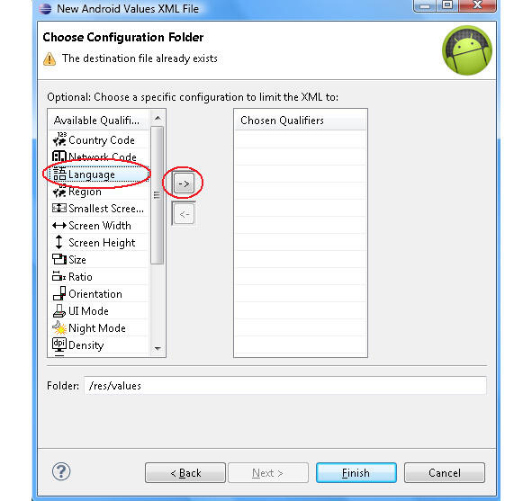 Для интернационализации Android-приложения в окне Package Explorer нажмем правой кнопкой мышки на узле проекта и в контекстном меню выберем команду New | Other | Android | Android XML Values File и нажмем кнопку Next. В окне мастера в поле File: введем имя файла strings. xml и нажмем кнопку Next, в списке Optional: Choose a specific configuration to limit the XML to: выберем Language и нажмем кнопку ->. В поле Language введем ru и нажмем кнопку Finish. В результате в каталоге res проекта будет создана папка values-ru с файлом strings. xml.