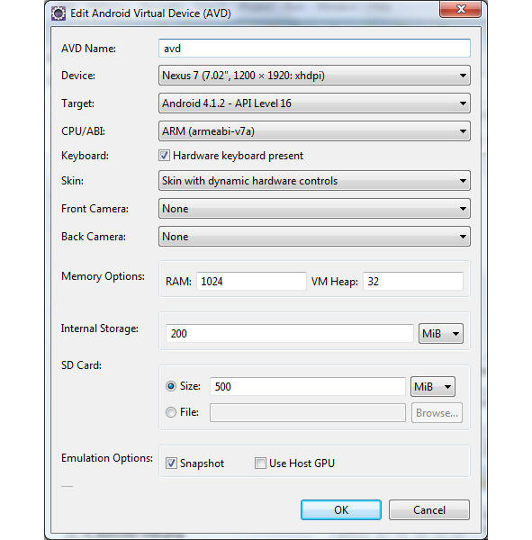 В разделе Emulation Options: с помощью флажка Snapshot определить ускорение повторного запуска виртуального устройства, так как его состояние будет сохраняться при закрытии, с помощью флажка Use Host CPU определить ускорение работы эмулятора, так как он будет использовать CPU компьютера.