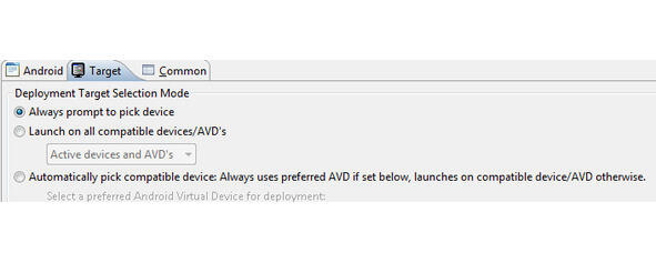 В списке Target: выбрать версию Android-платформы устройства.