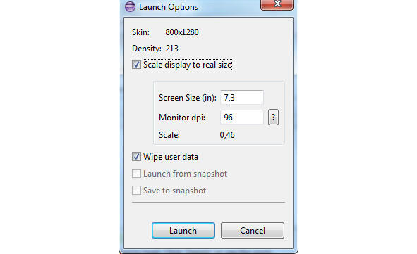 Флажок Wipe user data позволяет при запуске виртуального устройства стереть его сохраненное состояние, при этом будет отключена опция Launch from snapshot.