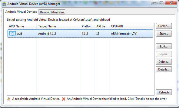 По умолчанию приложение AVD Manager создает конфигурацию виртуального устройства в каталоге [user]\.android\avd файловой системы компьютера. Если в пути данного каталога будут присутствовать русские буквы, виртуальное устройство не запустится. Кроме того, запуск виртуального устройства занимает значительное время, поэтому рекомендуется как можно реже его закрывать.