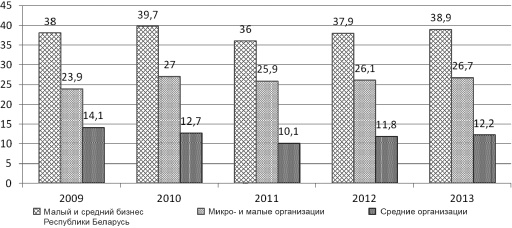 Рис. 3.7. Удельный вес инвестиций в основной капитал субъектов малого и среднего предпринимательства Республики Беларусь в общем объеме инвестиций в основной капитал в 20092013 гг., % [21]