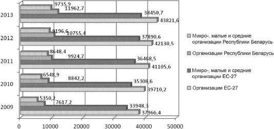 Рис. 3.10. Производительность труда в Республике Беларусь и ЕС27 в 20092013 гг., евро/чел [2124]