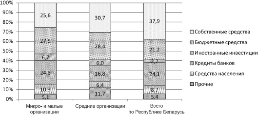 Отметим, что высокая инвестиционная активность организаций малого и среднего бизнеса определяет необходимость поиска и привлечения дополнительных источников финансирования. В 2013 г. основной объем инвестиций микро- и малых организаций осуществлялся за счет бюджетных средств (27,5 %) и кредитных ресурсов (24,8 %). В финансировании инвестиционной деятельности средних организаций их доля составляла 28,4 и 16,8 % соответственно (рис. 3.9). Вместе с тем иностранные инвестиции мало задействованы в процессе обновления и расширения основного капитала (6,7 % для микро-и малых и 6 % для средних организаций).