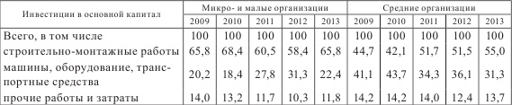 Микро- и малые организации направляют около 65 % инвестиций в основной капитал на строительно-монтажные работы. На приобретение машин, оборудования, транспортных средств направляется в 3 раза меньше денежных средств, что можно объяснить в основном их непроизводственной деятельностью. Для средних организаций характерная более высокая доля вложений в машины, оборудование, транспортные средства по сравнению с малым бизнесом (в 2013 г. 31,3 % против 22,4 %), однако сохранен приоритет инвестирования в строительно-монтажные работы (в 2013 г. 55,0 %).