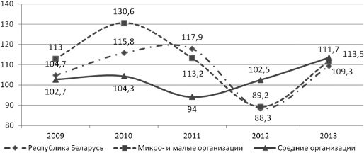 Рис. 3.6. Динамика темпов инвестиций в основной капитал микро-, малыми и средними организациями Республики Беларусь в 20092013 гг. [21]