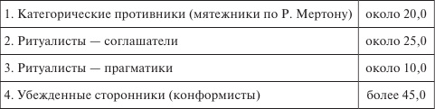 Две формы девиации по Р. Мертону, которые он назвал инновации и ретритизм, выделить не удалось. Первая из них, «инновация», предполагает тип поведения, который предусматривает определенное «творчество», поиск других, более устраивающих актора средств достижения цели. Вторая форма относится к случаю, когда актор деятельности не признает ни ценности-цели, ни норм-средств. Но его отличие от группы «мятежников» заключается в том, что он об этом предпочитает молчать. Возможно, что именно поэтому исследователям не удалось этих респондентов «вычислить». Полученное в итоге распределение мнений ученых, с которыми проводилось интервью, может быть представлено следующим образом (в процентах):