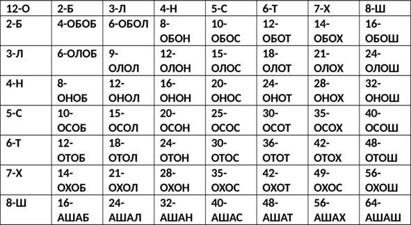 В триадной форме: боб, бол, бон, бос, бот, бох, бош; лоб, лол, лон, лос, лот, лох, лош; ноб, нол, нон, нос, нот, нох, нош; соб, сол, сон, сос, сот, сох, сош; тоб, тол, тон, тос, тот, тох, тош; хоб, хол, хон, хос, хот, хох, хош; шоб, шол, шон, шос, шот, шох, шош.