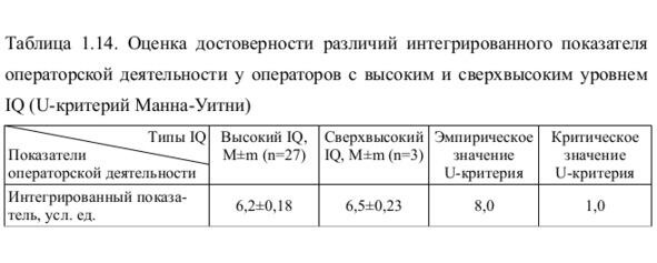 Как следует из табл. 1.14, в группе операторов со сверхвысоким психометрическим интеллектом интегрированный показатель операторской деятельности оказался на 4,6% выше, чем у операторов с высоким психометрическим интеллектом, что соответствует более высокой эффективности операторской деятельности у лиц со сверхвысоким IQ. Однако обнаруженное различие оказалось статистически недостоверным (p> 0,05, Uэмп.> Uкр.). Следовательно, в профессиональной деятельности обследуемых операторов сверхвысокий уровень психометрического интеллекта не является фактором, определяющим более высокую эффективность реальной операторской деятельности по сравнению с операторами с высоким IQ.