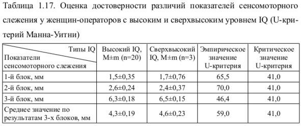 Далее анализировались группы женщин-операторов с высоким и сверхвысоким IQ. Поскольку распределение исследуемых выборок значительно отличается от нормального распределения, нами использовался непараметрический U-критерий Манна-Уитни (табл. 1.17).