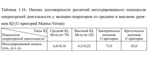 Как следует из табл. 1.16, в группе женщин-операторов с высоким психометрическим интеллектом интегрированный показатель операторской деятельности оказался на 3,2% выше, чем у женщин-операторов со средним психометрическим интеллектом, что соответствует более высокой эффективности операторской деятельности у лиц с высоким IQ. Однако обнаруженное различие оказалось статистически недостоверным (p> 0,05, Uэмп.> Uкр.). Следовательно, в профессиональной деятельности обследуемых женщин-операторов высокий уровень психометрического интеллекта не является фактором, определяющим более высокую эффективность реальной операторской деятельности по сравнению с женщинами-операторами со средним IQ.