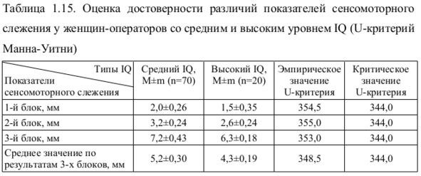Как уже отмечалось, между женщинами-операторами и мужчинами-операторами были обнаружены достоверные различия в эффективности сенсомоторного слежения по среднему значению для всех блоков. В связи с этим нами проводилась оценка достоверности различий показателей сенсомоторного слежения у женщин-операторов с различным уровнем психометрического интеллекта. В начале анализировались группы женщин-операторов со средним и высоким IQ. Поскольку распределение одной из исследуемых выборок (группа высокого IQ) значительно отличалось от нормального распределения, то нами использовался непараметрический U-критерий Манна-Уитни (табл. 1.15).