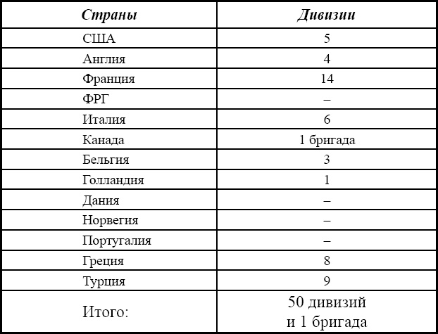 В 1955 году численность войск Североатлантического союза увеличилась более чем в 4 раза. Количество военных формирований приведено в таблице 2.