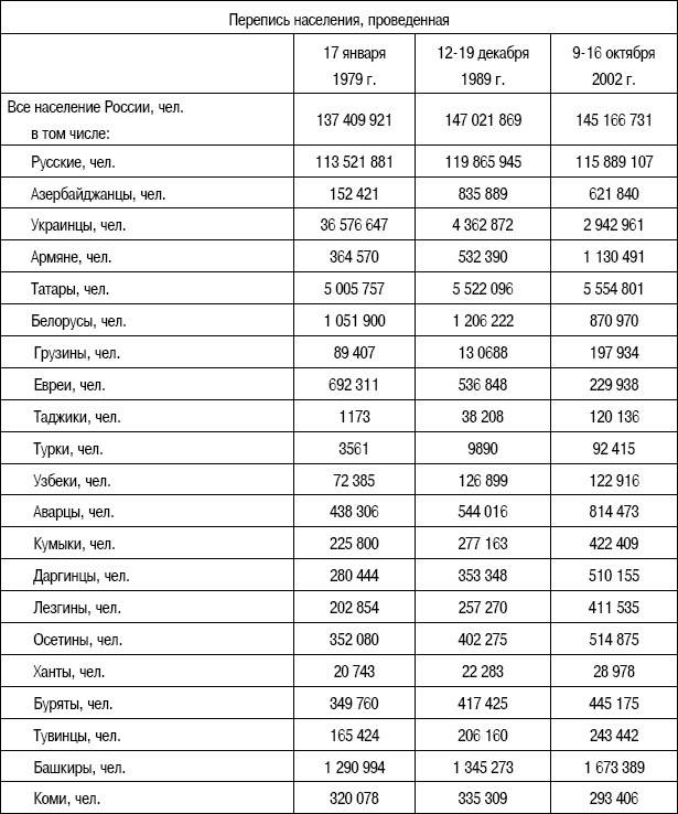В целом в Российской Федерации проживает более 150 национальностей и народностей. По численности русские занимают первое, татары второе, украинцы третье и башкиры четвертое места. Из приведенной таблицы видно, что в 2002 году, по сравнению с 1979 годом, в стране уменьшилась численность русских, украинцев, белорусов, евреев и коми, а по сравнению с 1989 годом русских, азербайджанцев, украинцев, армян, белорусов, евреев, узбеков и коми. Уменьшилась в стране численность некоторых национальностей и в связи с распадом Советского Союза. К сожалению, в России населения из года в год становится все меньше.