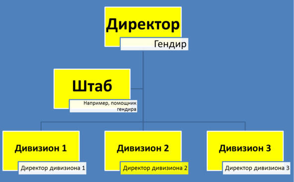 Это такая организационная структура, в которой выделяются относительно самостоятельные крупные подразделения, ответственные за конкретные продукты (товары или услуги) фирмы. Количество продуктовых подразделений может быть практически любым.