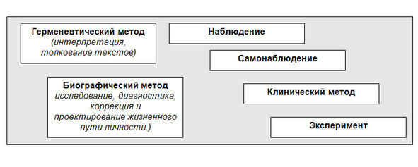 Авторы сводят число основных психологических методов к шести: 1) герменевтический, соответствующий такому состоянию науки, когда субъект и объект не противопоставлены, мысленная операция и метод науки тождественны; 2) биографический, предполагающий выделение целостного объекта познания в науке о психике; 3) наблюдение, в котором дифференцируются объект и субъект познания; 4) самонаблюдение, при котором происходит превращение субъекта в объект на основе предшествующей дифференциации; 5) клинический, когда ставится задача перехода от внешне наблюдаемого к внутренним механизмам; 6) эксперимент, предполагающий активное противостояние субъекта познания объекту, при котором учитывается роль субъекта в процессе познания.