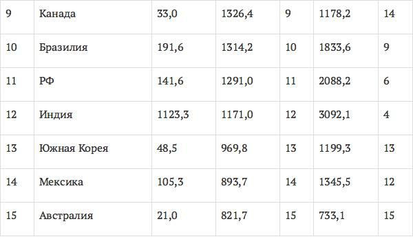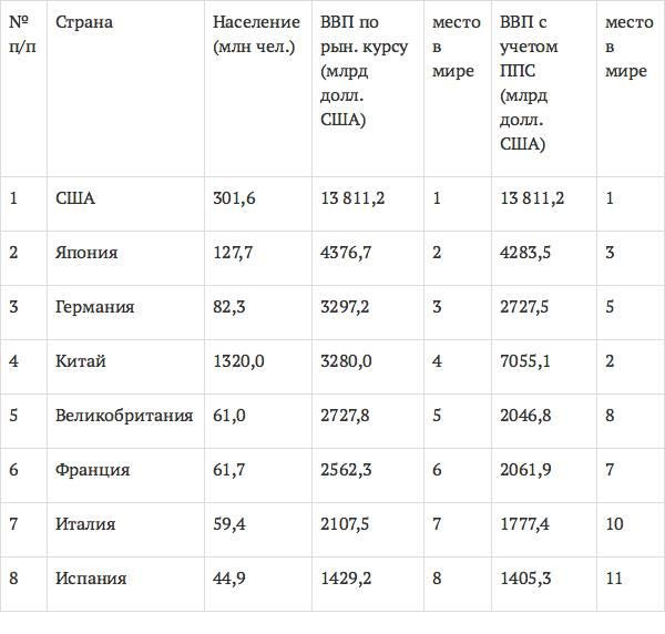 Как видно из таблицы, в 2007 г. Россия по производству ВВП в ценах по рыночному курсу занимала 11-е место, а по ППС 6-е. Правда, производство ВВП на душу населения в стране было лишь несколько выше среднемирового.