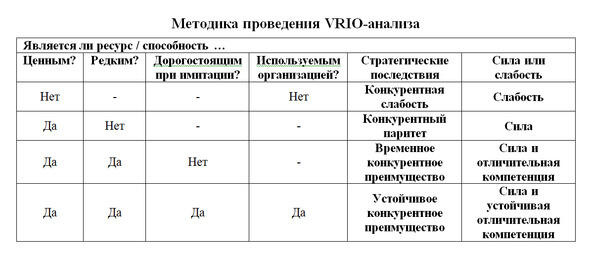 Как видим, чтобы выявить пользу от того или иного ресурса или способности, нужно проверить его на ценность, выяснить является ли ресурс/способность редким, дорого ли ресурс/способность воспроизвести и «используемый?» ли ресурс/способность организацией.