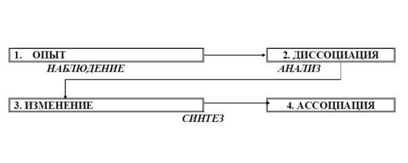 Сначала человек накапливает опыт, который является исходным строительным материалом для творчества. Затем этот опыт он разлагает в своей голове, диссоциирует на части. На следующем этапе полученные элементы подвергаются изменению (уменьшению, увеличению и др.), а на завершающей фазе из диссоциированных измененных элементов слагаются новые комбинации, выступающие как результат творческого процесса.