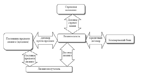В свою очередь договор лизинга это договор, в соответствии с которым арендодатель (лизингодатель) обязуется приобрести в собственность указанное арендатором (лизингополучателем) имущество у определенного им продавца и предоставить лизингополучателю это имущество за плату во временное владение и пользование.[9] В наиболее общем виде схема взаимоотношений субъектов при лизинговой сделке в ее классическом понимании представлена на рис. 1.
