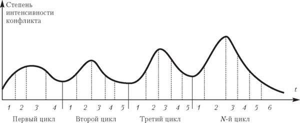 При остром и длительном конфликте фазы могут циклически повторяться. После фазы «затухание конфликта» или даже «прекращение конфликта» может начаться фаза «начало конфликта» с прохождением фаз пика, затухания, прекращения конфликта, затем может начаться следующий цикл и т. д. При этом с каждым циклом пик конфликта становится все выше, степень остроты и интенсивности увеличивается, а длительность фаз может расти, и возможности разрешения конфликта в каждом последующем цикле сужаются и его становится все трудней урегулировать.